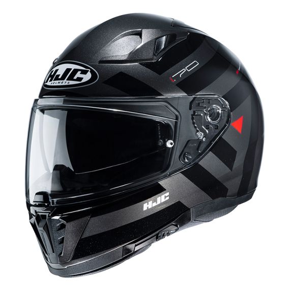 The i70 is a modern and sleek sport-touring helmet composed of HJC’s advanced polycarbonate material. The full-face shell is noticeably more compact and lighter than its predecessor, the IS-17. The i70 features an inner, drop-down sun visor with a new, easy-to-use lever. Top vents optimize ventilation into the interior air channels and out through the exterior exhaust vent with an aerodynamic spoiler design.