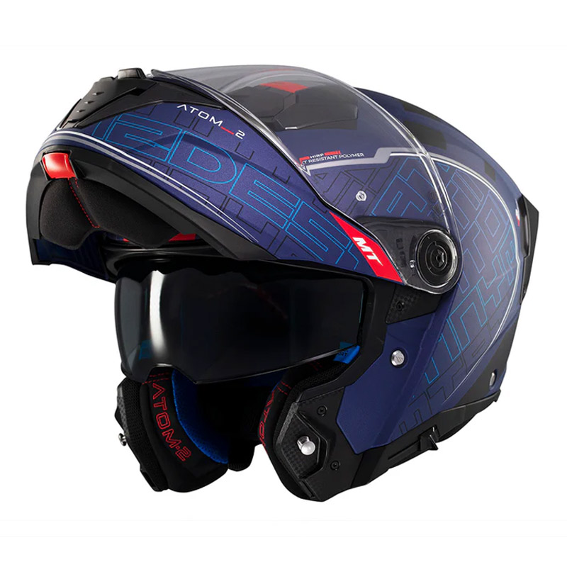 MT Atom 2 SV is a modular helmet with an aerodynamic design perfect for touring use. Made of HIRP, a very resistant and durable material. It has a large screen with anti-scratch treatment that offers a wide field of vision, compatible with Pinlock® and anti-fog systems (not included). Sun visor that guarantees correct protection against UV rays. Ventilation system with MT-AFCS technology that guarantees correct air flow.