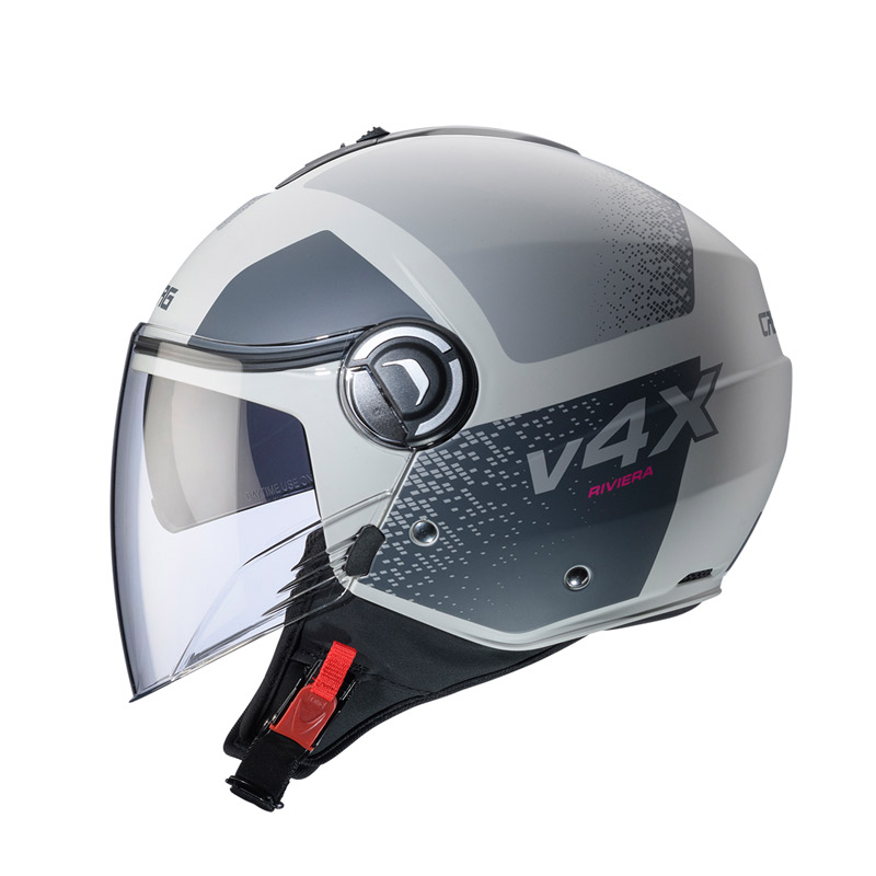 Riviera V4X is the new demi jet from Caberg with an innovative and elegant look, conceived for everyday urban routes. It is available in two shell sizes in order to offer the best fitting proportion between the shell volume and the motorcyclist’s head. Moreover, thanks to its small sized shell dimension it can easily fit under narrow seats.